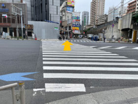 横断歩道を渡り、左手に「ファミリマート」が見える道のほうへ進みます。 -