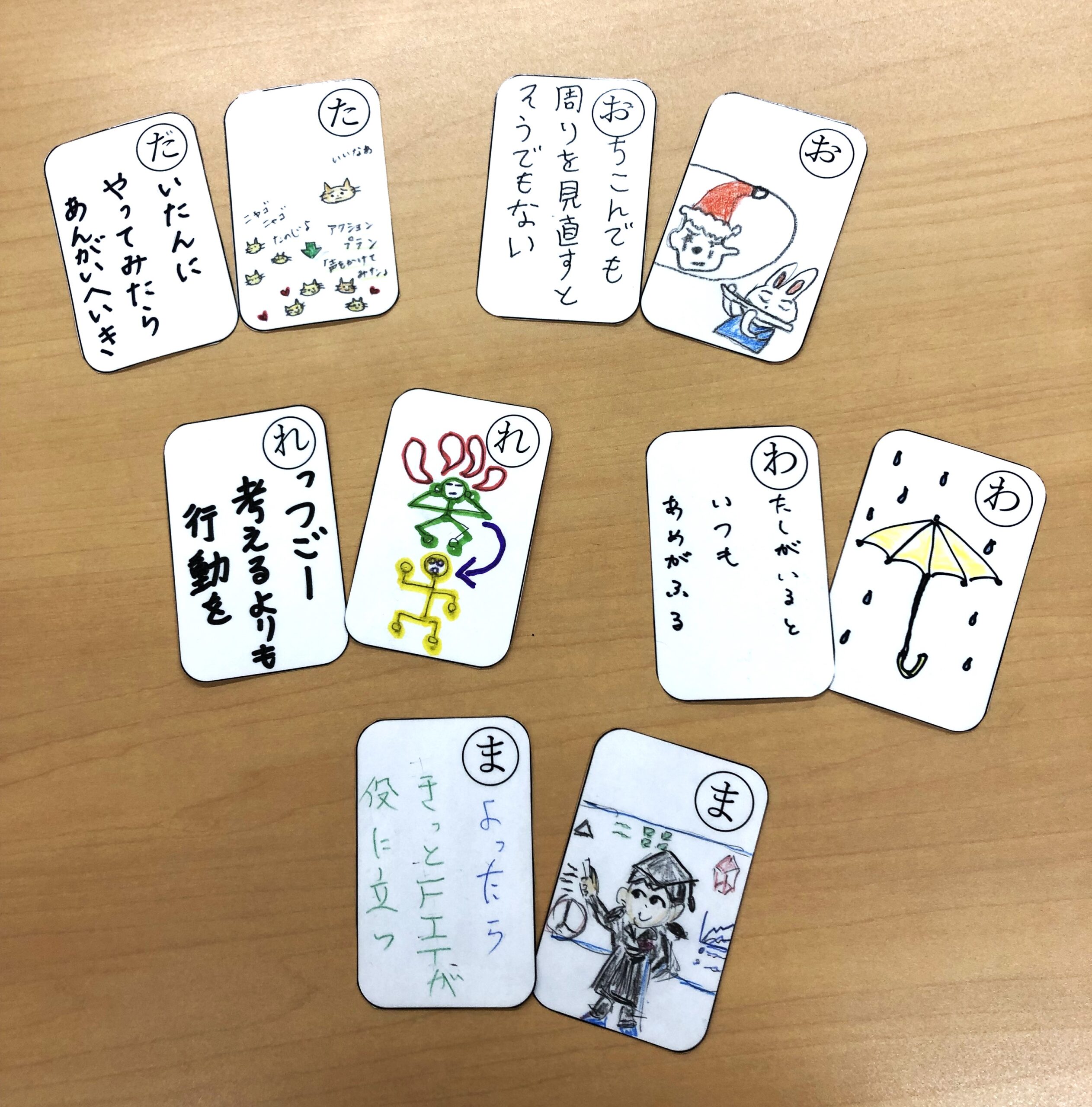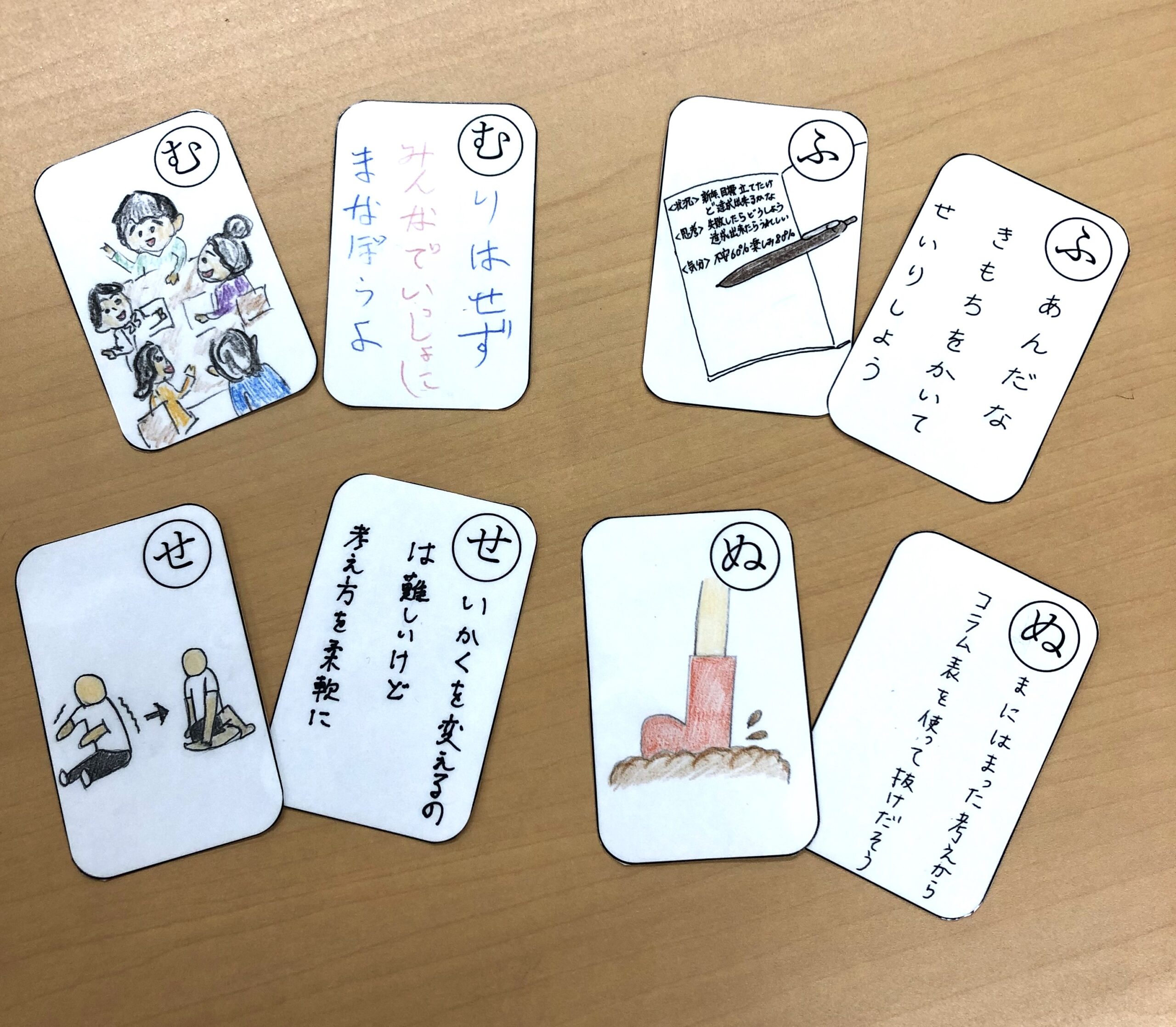 FITプログラムで取り組むことの内容が、以下の写真のかるたにぎゅっと凝縮されています!セリフを考えるのにプログラムの資料をめくり考えた方も、久しぶりにイラストを描くことは戸惑いがあった方も、カラフルで素敵な作品ができました👏👏👏