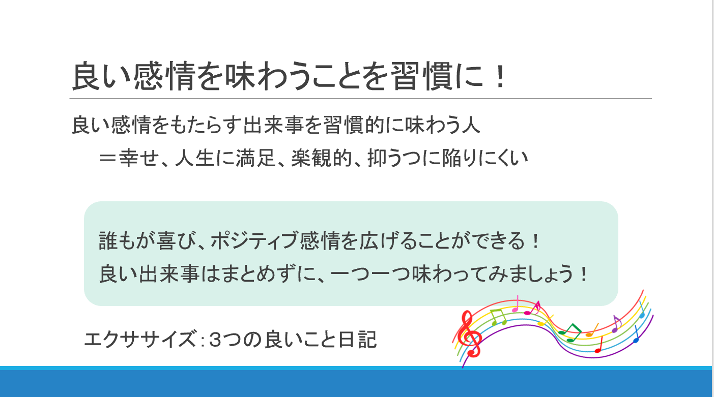 前半のテーマは「ポジティブ感情を増やす」喜び、感謝、希望、自尊感情などのポジティブ感情を増やすと、抑うつや不安を打ち消したり、視野を広く持てると言われています。本日は、誰でもポジティブ感情を増やすことができるエクササイズ「3つの良いこと日記」を行いました。日々のちょっとした良いことをそのまま過ぎて行かずに、思い返してしっかりと味わうこと、私もこのポジティブ心理学に出会ってから、普段から意識して過ごしています🎵