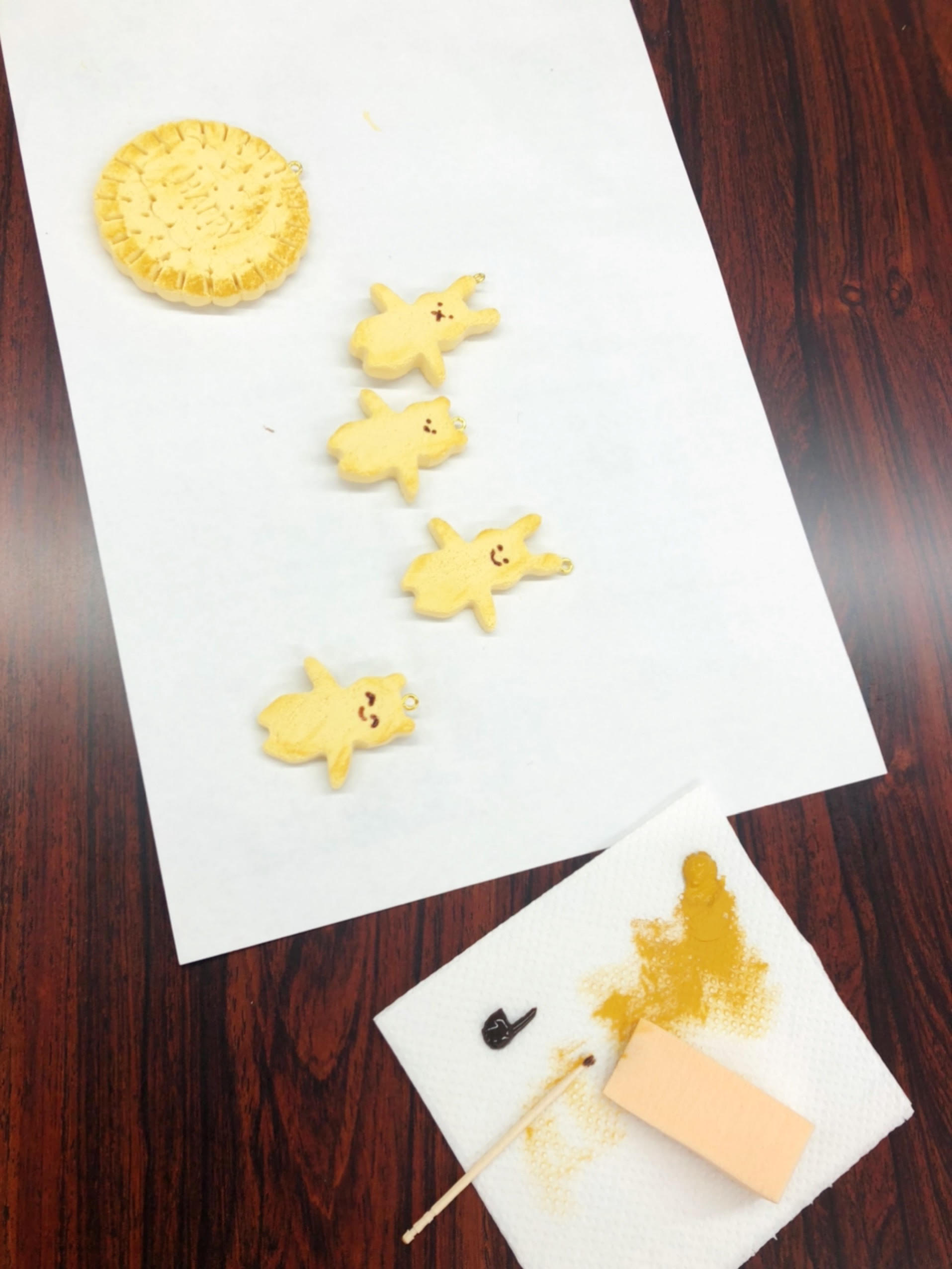 手順としては①粘土に絵の具を混ぜて伸ばす、②型を抜く、③より本物に近づくように絵の具で“焦げ目”をつける、④チョコソースに見立てた絵の具でデコレーション、⑤ニス塗り となります。