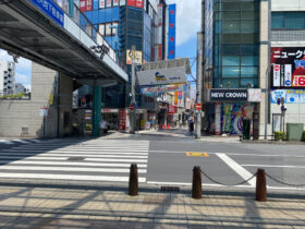 階段を下ってすぐの横断歩道を渡り、NEW CROWN(パチンコ屋)の前の通りを右折します。 -