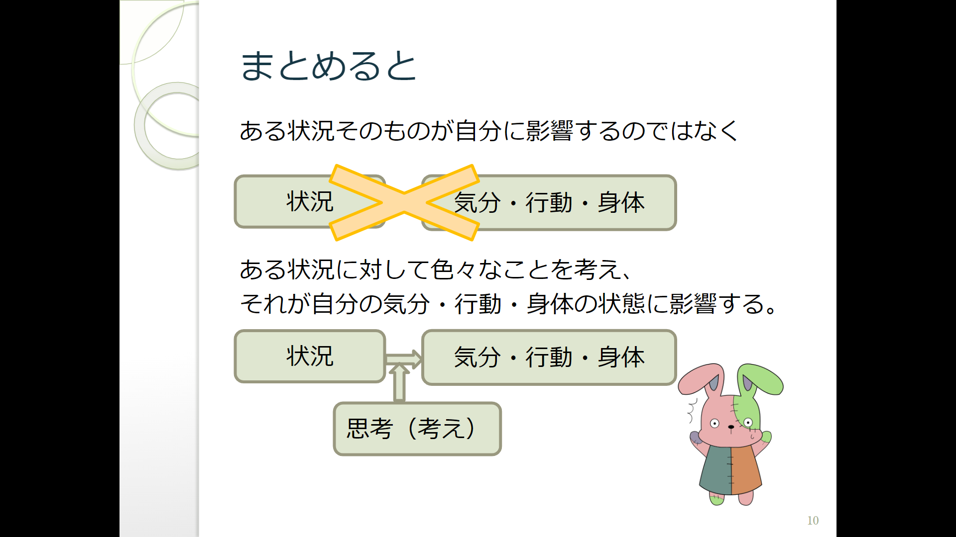 皆さん状況に対して、何かしらを考え、それが気分、行動、身体反応に影響すると言う事です。