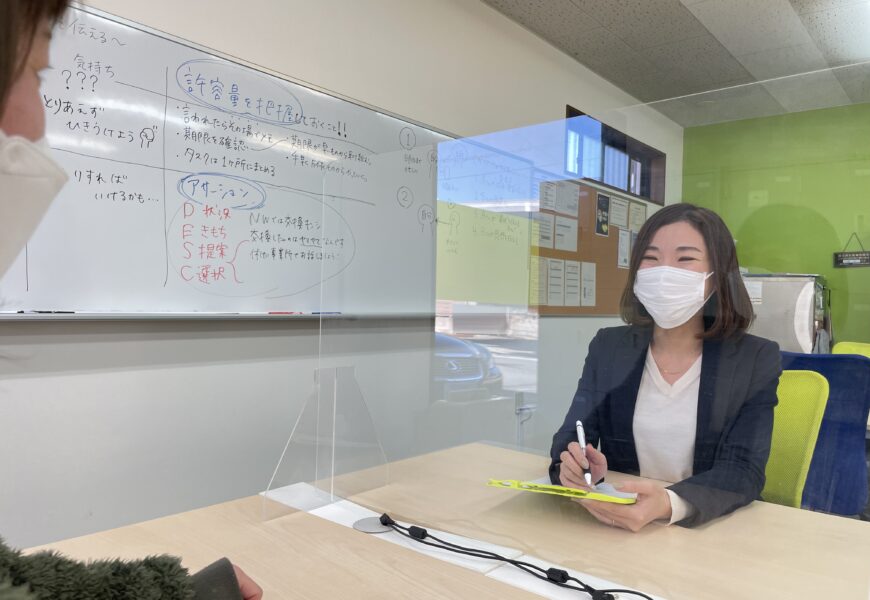 訓練や生活状況を振り返り、スタッフとの面談を通して、課題を見つけていきます。