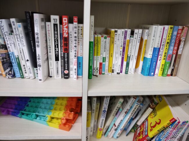 いろいろな本がありますね。資格試験の参考書、心理学の本。さらには息抜きのコミックと絵本も!!