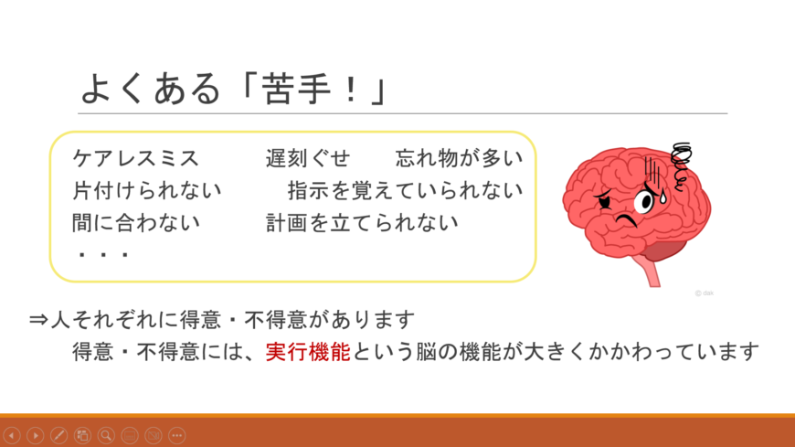 普段皆さんが何か苦手だな、上手くいかないな。と思っていることは、実行機能という脳の機能が大きく関わっている可能性が高いのです。