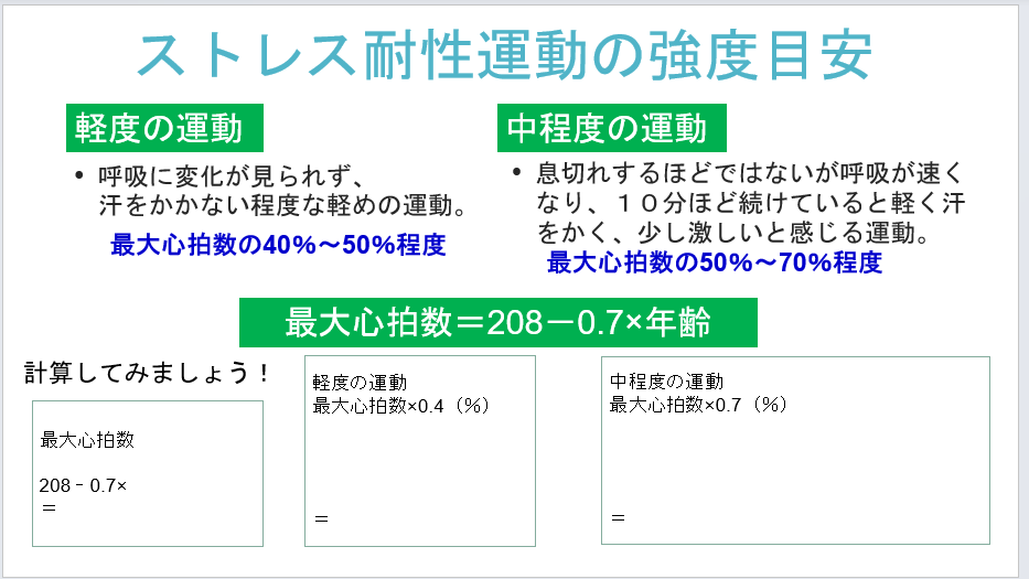 その中で実際に心拍数を計算していただき、軽度の運動、中程度の運動の強度目安を