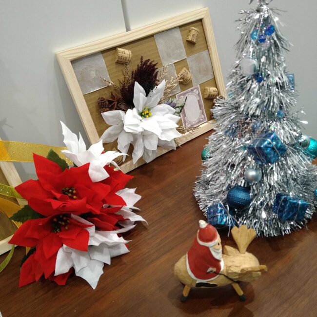 三軒茶屋センターの入り口にもツリーとサンタが登場しました。後ろの飾りは先日のフラワーコラージュで作成したものを置かせていただいています🌼