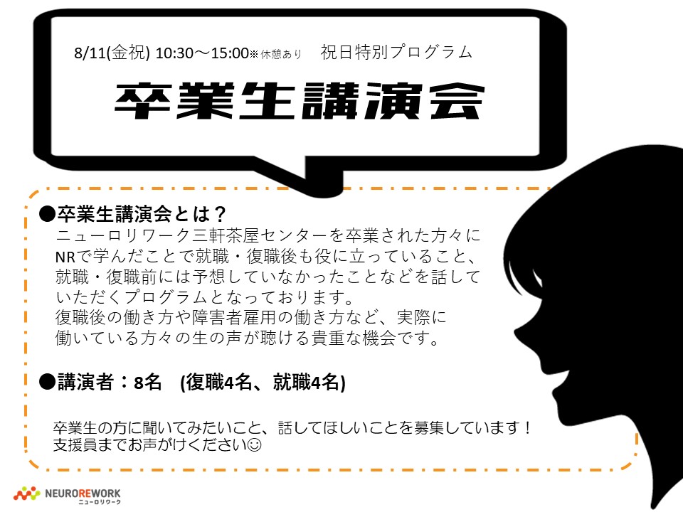 今回企画に応じて下さったのは8名の卒業生。復職された方はもちろん、障害者雇用や特例子会社で働く方、手帳があっても明らかにしないいわゆるクローズ就労の方までと様々。現役利用者の方もいつもの祝日以上に集まり、センター内もほぼ満員の状態です。