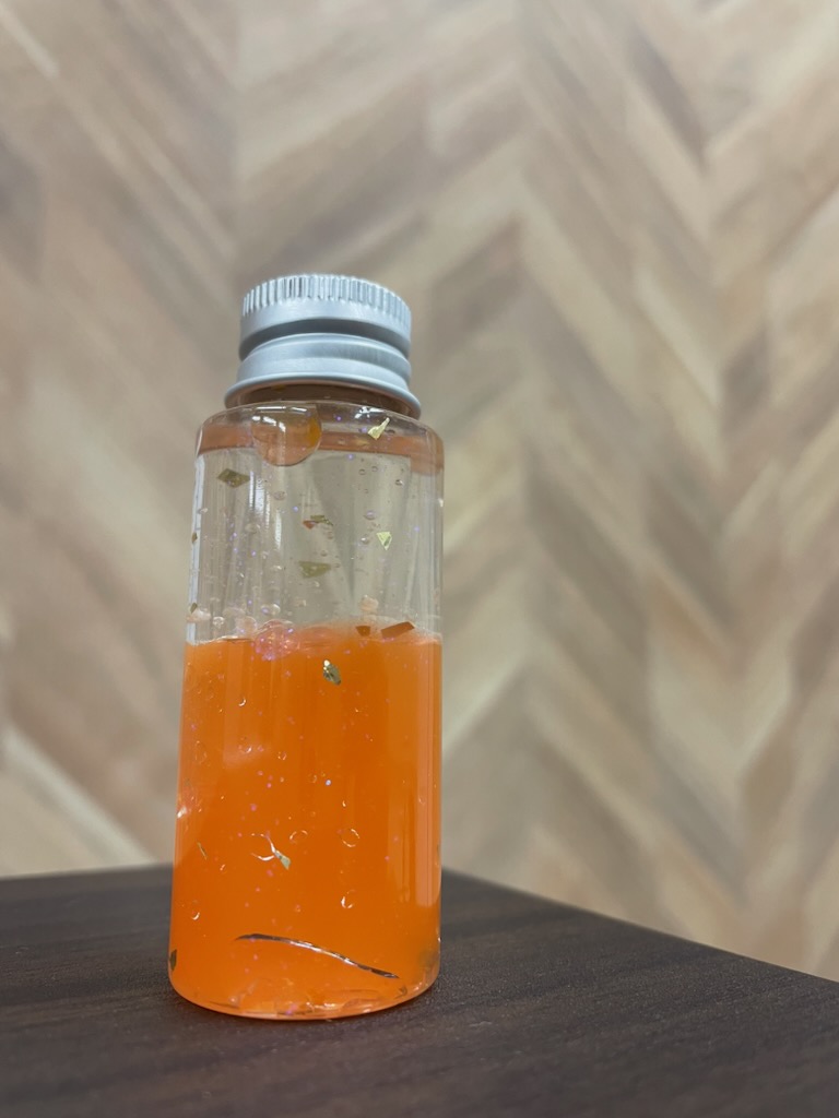 分かりにくいですが、ビーズやキラキラした粉末も入れてあり、ひっくり返すとそれらがゆっくりと動き、見ていると自然とゆったりとした気持ちになってきます😌