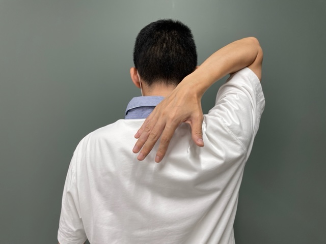 ①まずはどちらかの腕を写真のように頭の後ろに回します。