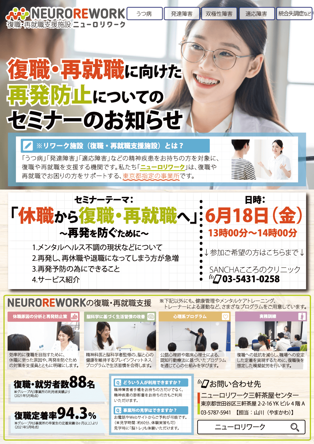 ニューロリワークでは、復職や再就職に向けたメンタルヘルス不調の再発防止に関するセミナーを実施します。
