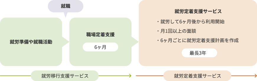 半年経過後、新たに「就労定着支援事業所」と契約を結び、その後最長3年間が就労定着支援のサービスを受ける利用期間となります。