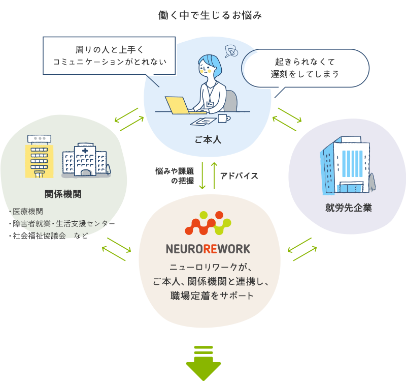 ニューロリワークが、ご本人、関係機関と連携し、職場定着をサポート