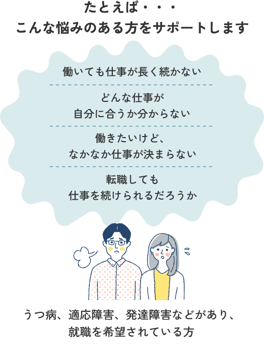 希望やお悩みを伺い、適性に合った仕事を一緒に考えたり、働き続けるために必要なスキル・知識の学習、健康管理など、長く安心して働き続けられるようにサポートを行っていきます。
